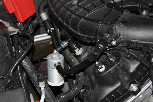 To combat this, we have developed an oil separator of our own design. Milled from solid billet aluminum this is a rock solid piece. It has a knurled tank base for easy removal to drain the spent oil and an O ring seal to prevent any leaks. We took this unit a step further and added a metal mesh filter to the intake side that collects the vapors, allowing them to grow into larger oil droplets and drains back into the tank. The tank holds 1.5 oz of fluid, while that may not sound like a lot, you shouldn’t see that much oil in your PCV system. Drain it every 2000-2500 miles and you will never come close to filling it.
