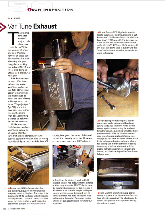 The kit was installed on a bone stock 12 Mustang GT 5.0 and from the results we see here in this article from the 5.0 Mustang & Super Fords October 2013 issue it looks like this BBK Performance Varitune axle back system picked up a solid 10 Horsepower and 10 ft/lb torque at the rear wheels!