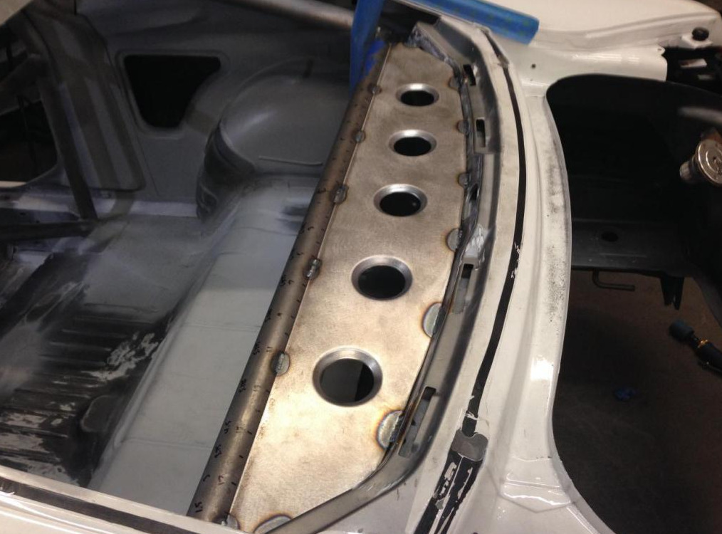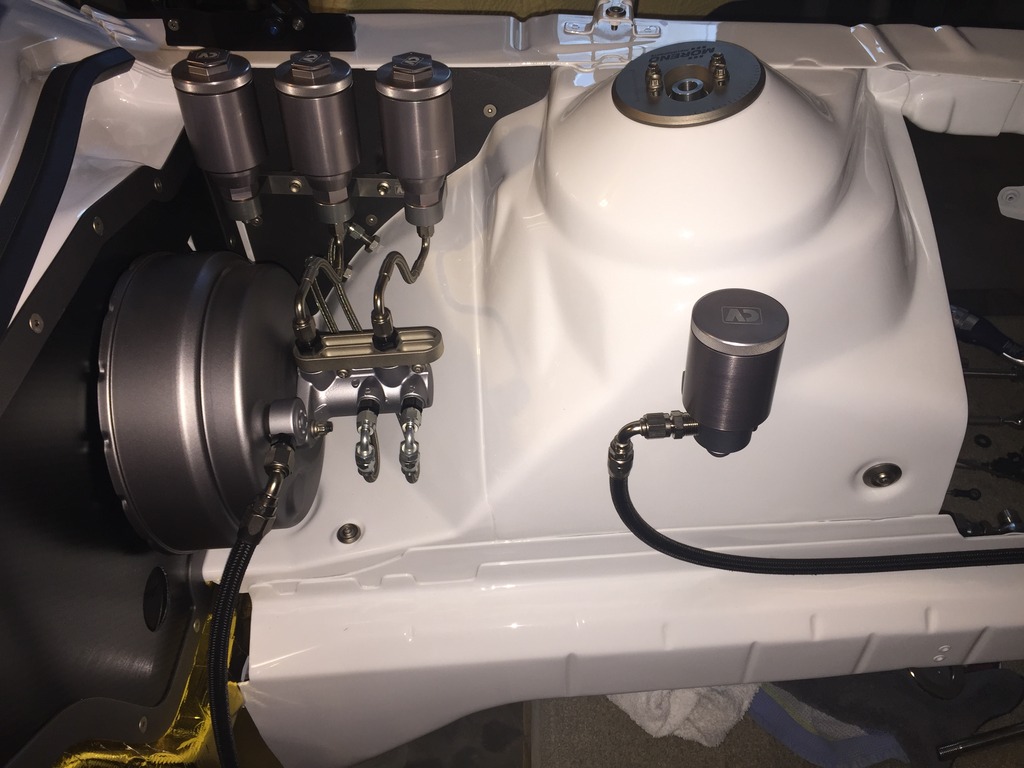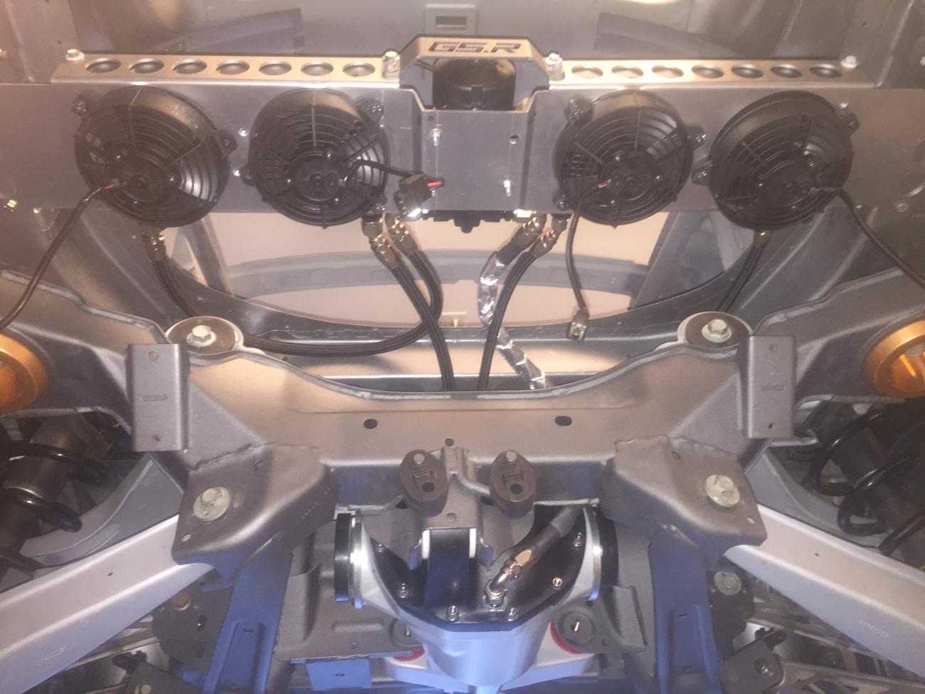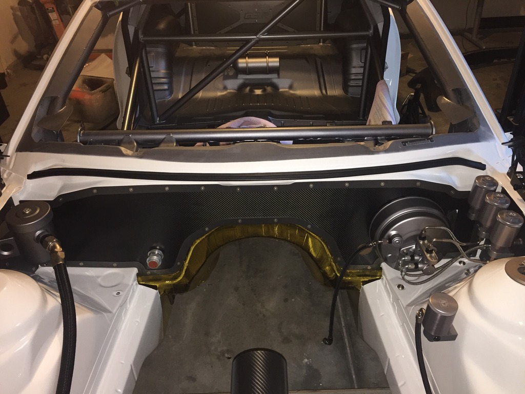Moving on to the Camaro's chassis, there is so much detail in every single part. Every hole that was no longer used in the engine bay was filled in and covered. The firewall was covered with a custom carbon fiber plate. A similar piece was made to replace the heavy factory steel that separated the back seat from the trunk. In the trunk, the spare tire well was cut out to shave more weight, and replaced by a custom made flat panel that was painted with the G5.R project logo. The floor was completely smoothed out, too, with some pretty nifty steel “floor mats.” Since this is to be a serious track car, like the Camaro Z/28 on steroids, a roll cage was also added to the interior, which will be integrated with the headliner. A fire suppression system complements it nicely. Underneath, the floorpan was completely covered in a gold heatshield. The roof skin was completely removed, which will be replaced by carbon fiber. Carbon is used throughout the body, with the Moreno family’s own brand of components. Custom tubular front and rear bumper supports replace the heavy factory pieces, as do tubular engine and differential cradles. While originally some off-the-shelf parts were used on the suspension, every piece has been replaced with custom made components designed by the Morenos. It’s amazing what a couple of engineering students can do. The shocks are even custom-valved Penskes.